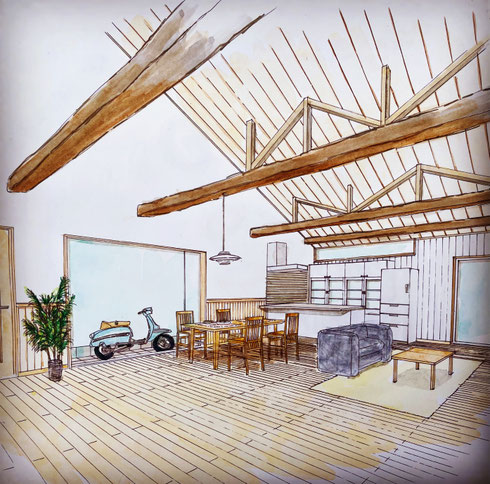 バイクや車好きの方なら一度は考えたことがあるはずです。リビングから二重ガラスで断熱と防音対策をした大きなFIX窓からお気に入りのバイクを眺めれます。