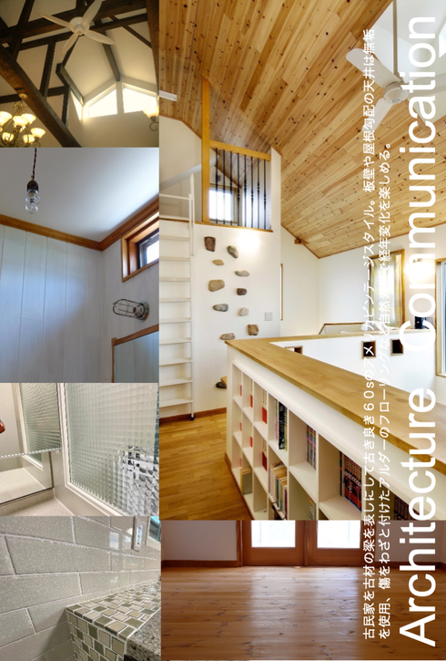 古民家で天井を解体し、古材の梁を表しにしてそれを上手く活用して古き良き60sのアメリカのビンテージスタイルのイメージでリフォーム。縦に板を張った板壁や屋根勾配の天井も羽目板を使用、傷をわざと付けたアルダーのフローリングなど自然素材で経年変化を楽しめる仕様にしています。